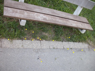 (Anm.: Auf dem oberen Foto sind die in der Fotodatei sichtbaren Kippen im Bereich der 1. Sitzbank markiert, auf dem unteren Foto diejenigen der rechten Bank)