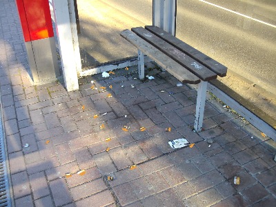 die Konsumation, Emmissionen und Hinterlassenschaften  konzentrieren sich jedoch in den Bereichen des Wartehäuschens, der an und für sich dafür angelegt ist, um den Reisenden Schutz vor Witterungseinflüssen zu bieten.