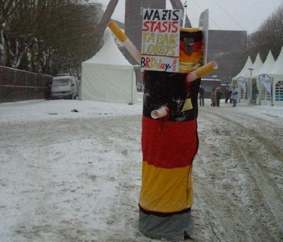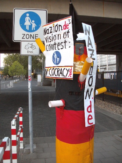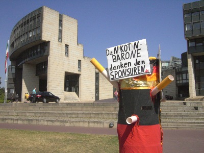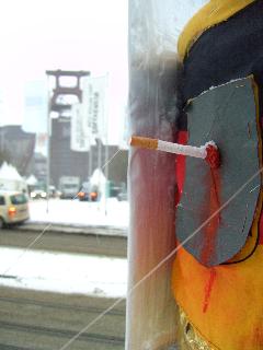 Nachdem der Eröffnungsfestakt von "ruhr.2010" begonnen und sich das Sicherheitspersonal zurückgezogen hatte, konnte TOM dann doch noch für die verbliebene halbe Stunde der "Mahnwache für die Opfer des Nikotin-Lobbyismus" die Sonnen-Strassenseite der Meinungsfreiheit beschreiten.